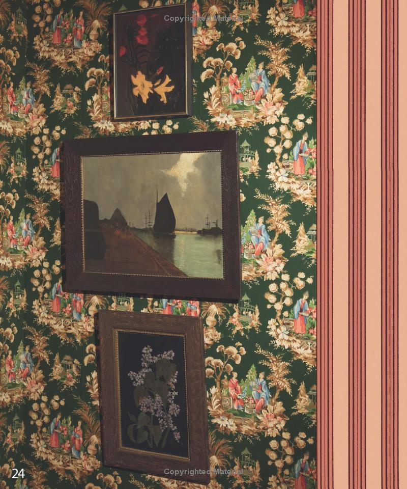 Từ giấy dán tường kẻ sọc tinh tế hòa quyện với họa tiết hoa Pháp, giá đỡ sách đồng hình sư tử đến khay khảm xà cừ lấp lánh, tất cả đều mang lại chiều sâu và cảm giác sang trọng nhưng không phô trương.