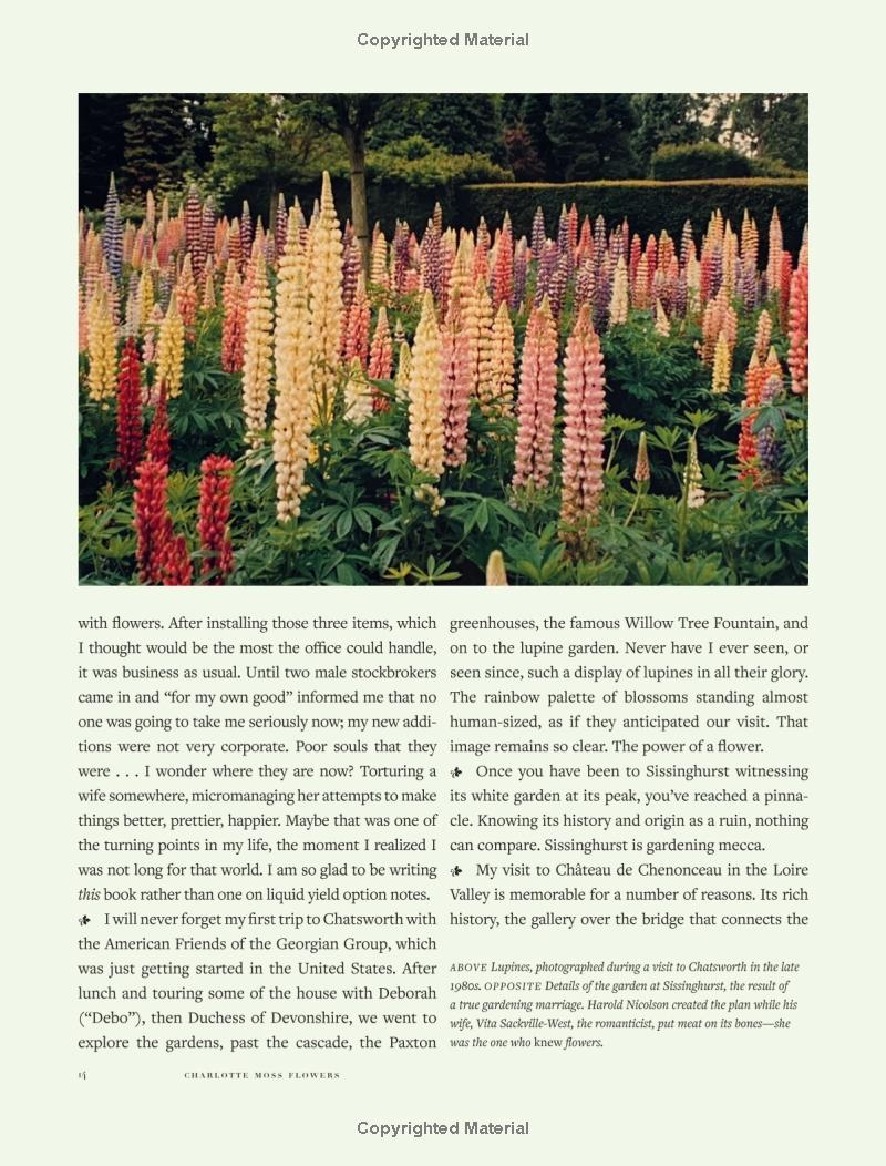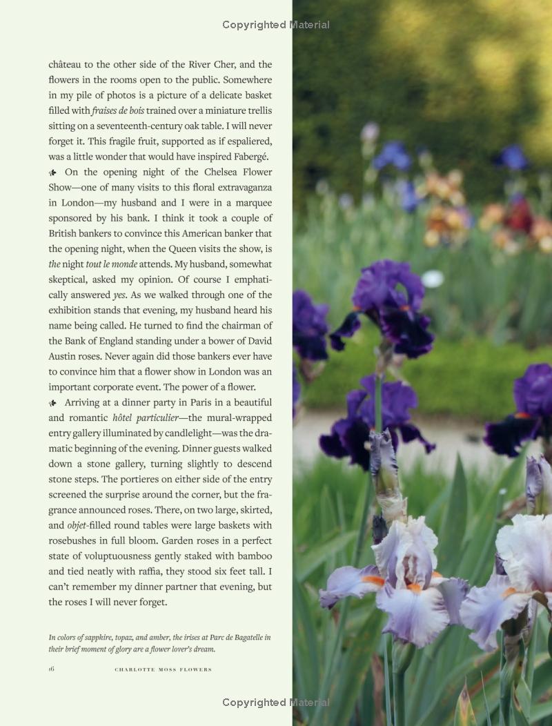 Nhà thiết kế nội thất nổi tiếng Charlotte Moss tôn vinh vẻ đẹp của hoa, truyền cảm hứng sử dụng chúng như điểm nhấn tinh tế trong trang trí, tiếp khách và đời sống thường nhật. Cô khuyến khích độc giả mang khu vườn vào không gian sống, từ những cụm hoa trên bàn đầu giường đến những lẵng hoa rực rỡ cho bữa tiệc và ngày lễ.