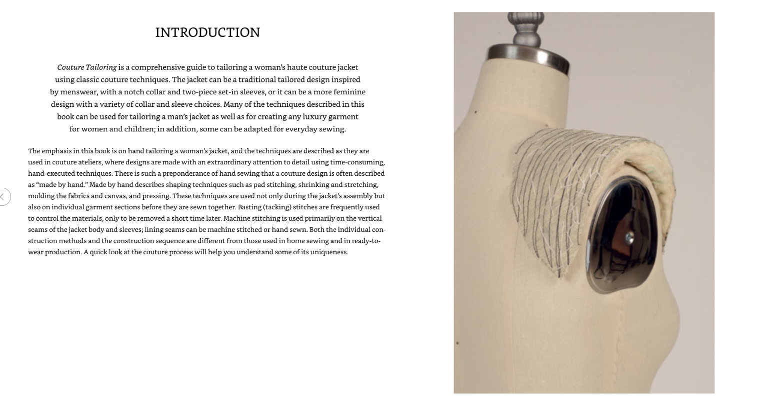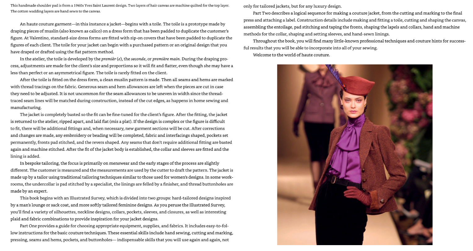 Dựa trên các kỹ thuật couture học được từ những thợ may bậc thầy, cuốn sách bắt đầu với phần giới thiệu về dụng cụ, vật liệu, các yếu tố thiết kế, cùng kỹ thuật may và xây dựng áp dụng cho mọi loại áo khoác.