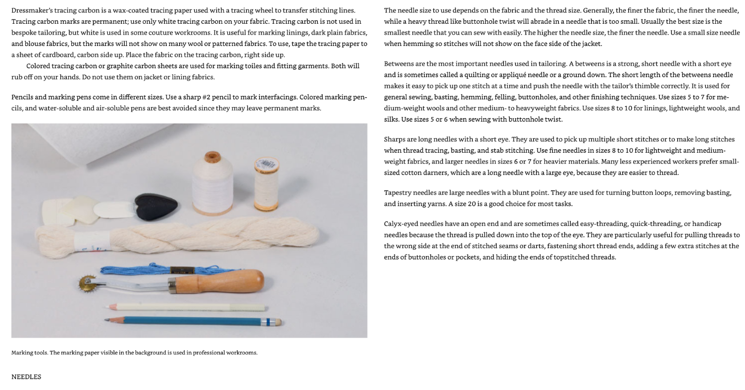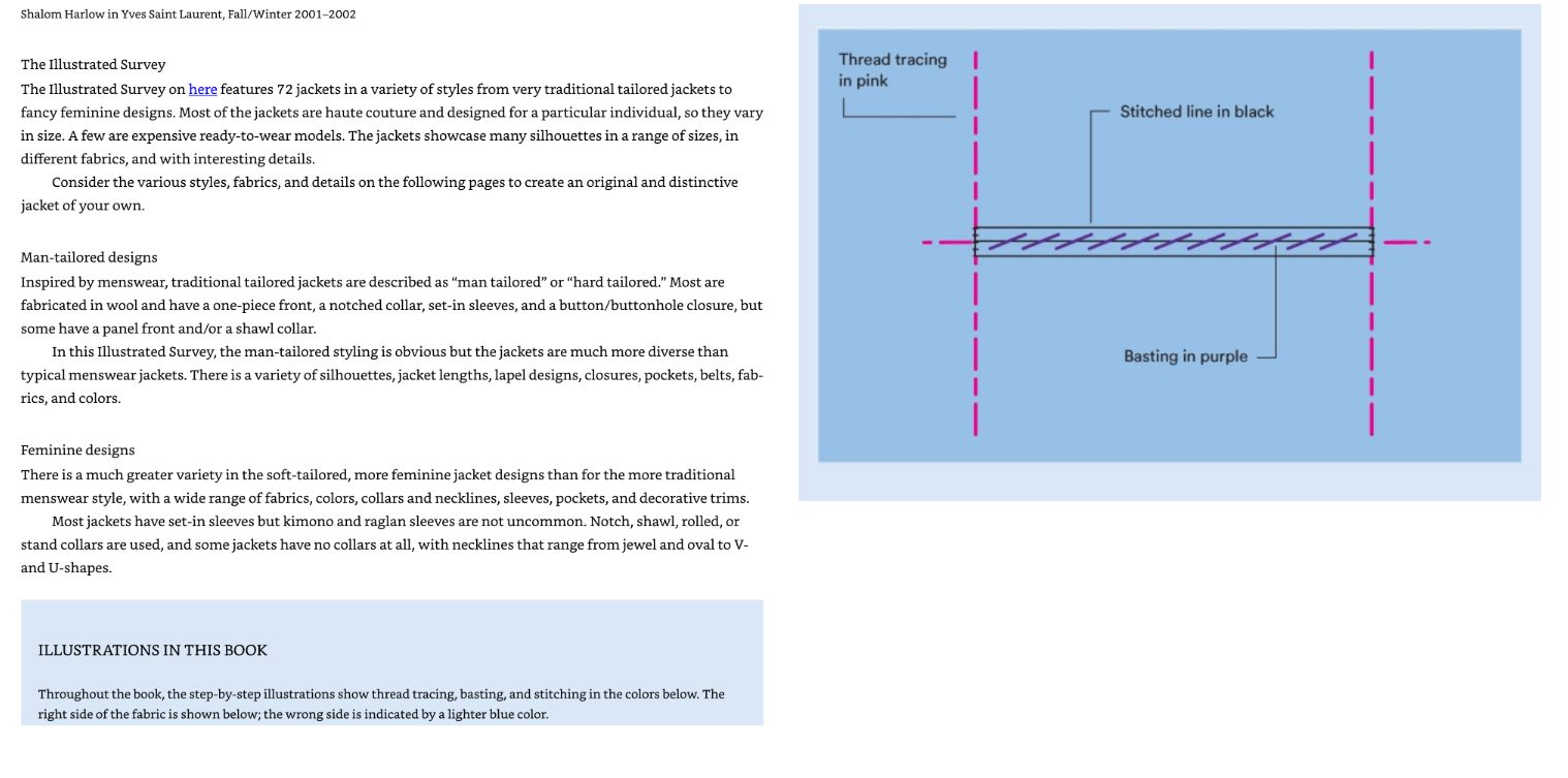 Phần hai cung cấp hướng dẫn minh họa từng bước để may một chiếc áo khoác couture, giải thích tất cả các lựa chọn thiết kế và phương pháp thay thế cho từng chi tiết như cổ áo, tay áo và túi. Couture Tailoring bao gồm hơn 800 minh họa từng bước, hơn 200 bức ảnh áo khoác couture từ Chanel, Dior, Yves Saint Laurent cùng hơn 100 mẹo may couture.