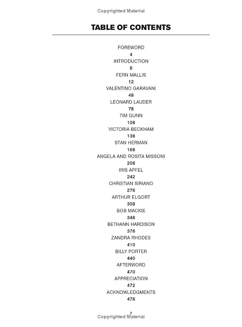 Cuốn sách giới thiệu 15 cuộc phỏng vấn mới với các tên tuổi nổi tiếng như Christian Siriano, Billy Porter, Zandra Rhodes, Iris Apfel, Victoria Beckham và Valentino. Mỗi người chia sẻ ảnh cá nhân, bản phác thảo và kỷ vật chưa từng công bố, giúp độc giả hiểu rõ hơn về con đường sáng tạo và phong cách của họ.