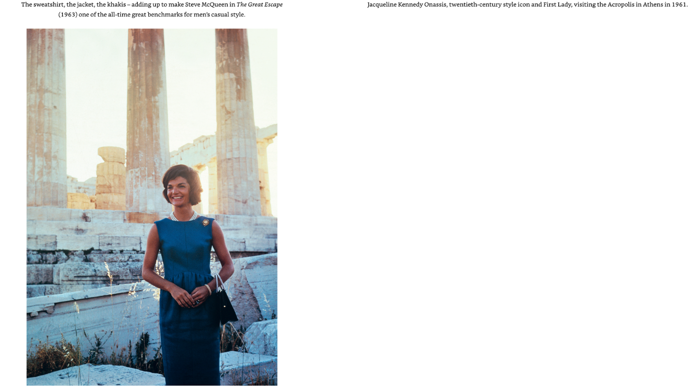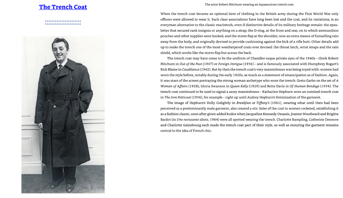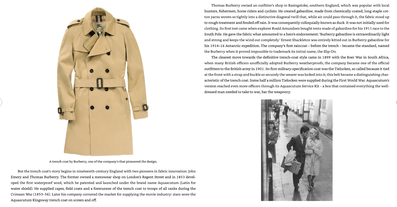 Cuốn sách giải thích cách từng món đồ quan trọng này ra đời, thương hiệu hoặc công ty khởi nguồn, và cách chúng định hình phong cách ăn mặc của chúng ta. Nó bao gồm các trang phục từ thập niên 1930 đến hiện đại, từ Marlene Dietrich đến Mick Jagger, minh họa vẻ đẹp vượt thời gian của những món đồ nền tảng.