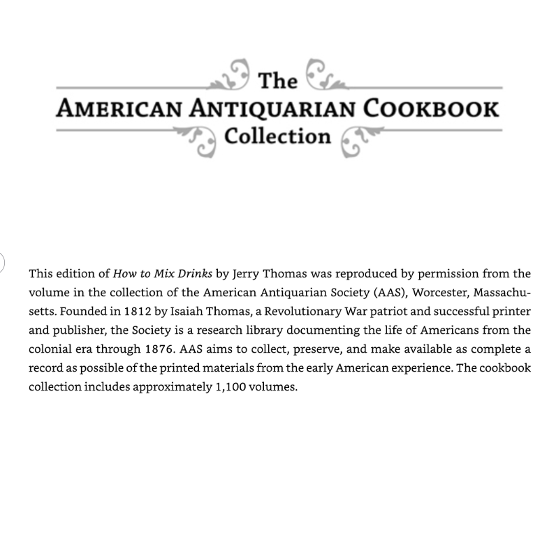 Ấn bản này được tái bản dựa trên bộ sưu tập của Hiệp hội Cổ vật Hoa Kỳ tại Worcester, Massachusetts, nơi lưu giữ và bảo tồn các tài liệu in ấn từ thời kỳ đầu của nước Mỹ. Cuốn sách không chỉ là hướng dẫn pha chế mà còn là tài liệu lịch sử về văn hóa uống rượu và ẩm thực Mỹ.