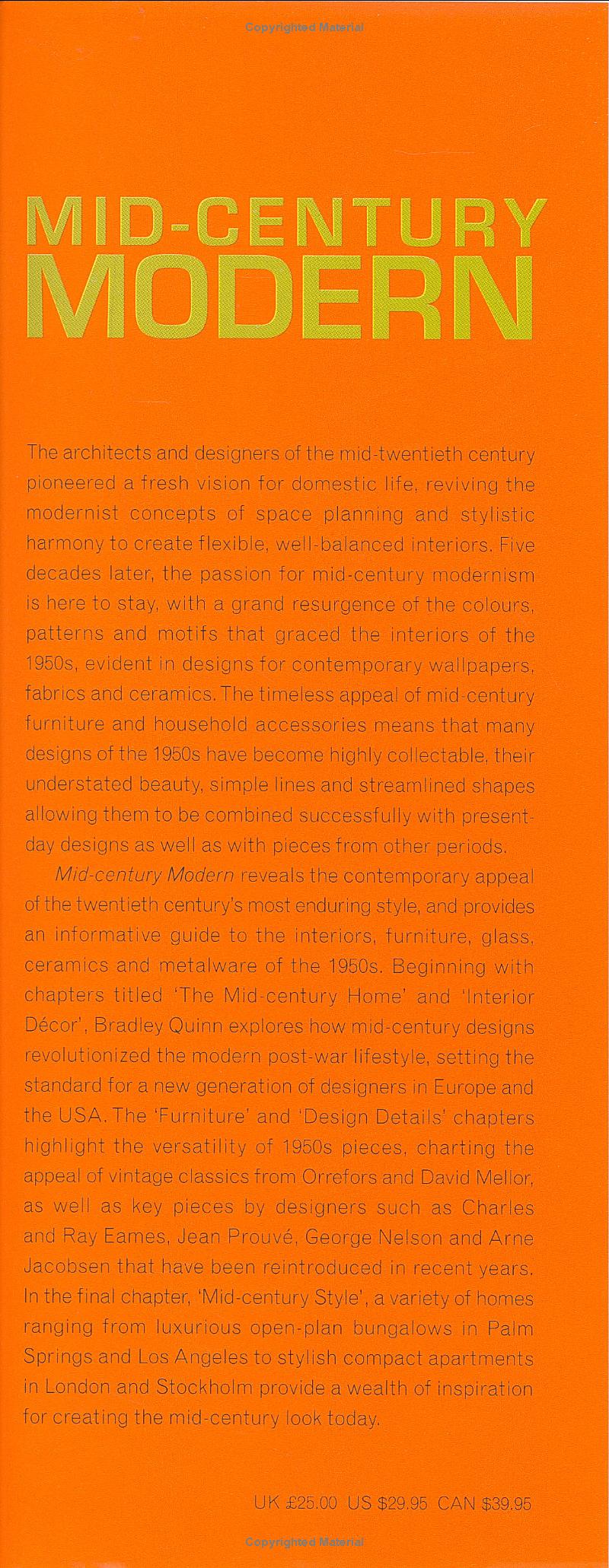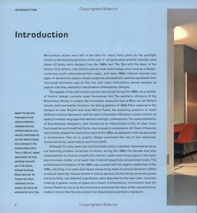 Cuốn sách tiếp tục giới thiệu các nghiên cứu điển hình minh họa những ngôi nhà đương đại tuyệt đẹp thể hiện phong cách giữa thế kỷ một cách mẫu mực và cho thấy diện mạo những năm 1950, cùng với những món đồ sưu tầm, có thể được kết hợp và phối hợp với các yếu tố nội thất của các phong cách khác và từ các thời đại khác.