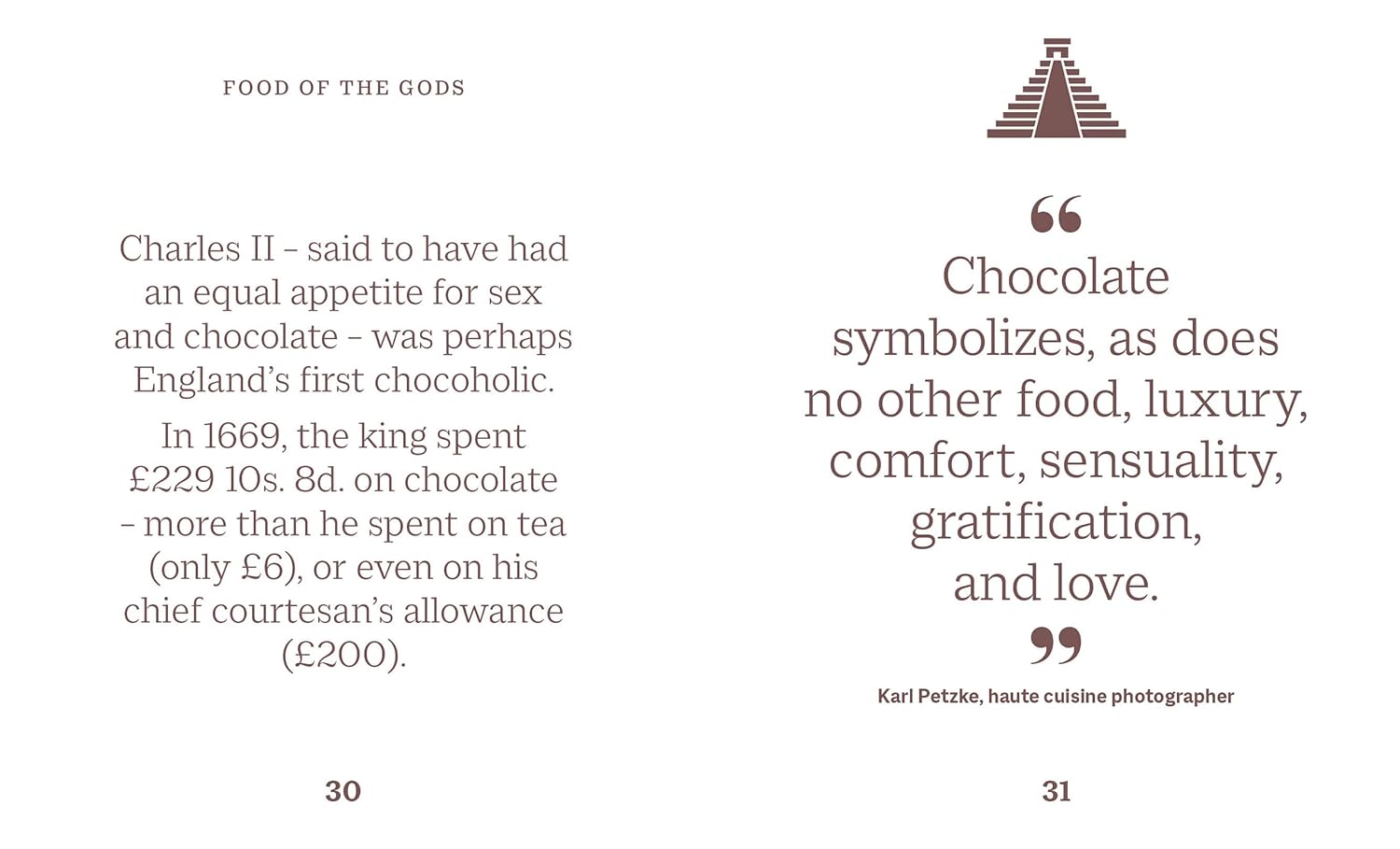 Từ những loại sô cô la nguyên chất nhất đến những hương vị kỳ lạ nhất bạn có thể tìm thấy, từ những món ăn hàng ngày đến những món xa xỉ, cuốn sách là một bữa tiệc nhẹ nhàng tôn vinh lịch sử, hương vị và văn hóa của sô cô la. Bên cạnh đó còn có các con số và thống kê, những câu nói dí dỏm, tục ngữ và chơi chữ, cùng những trích dẫn của những nhân vật xuất sắc về sô cô la, lý do tại sao nó lại ngon đến thế và cách thưởng thức tốt nhất.