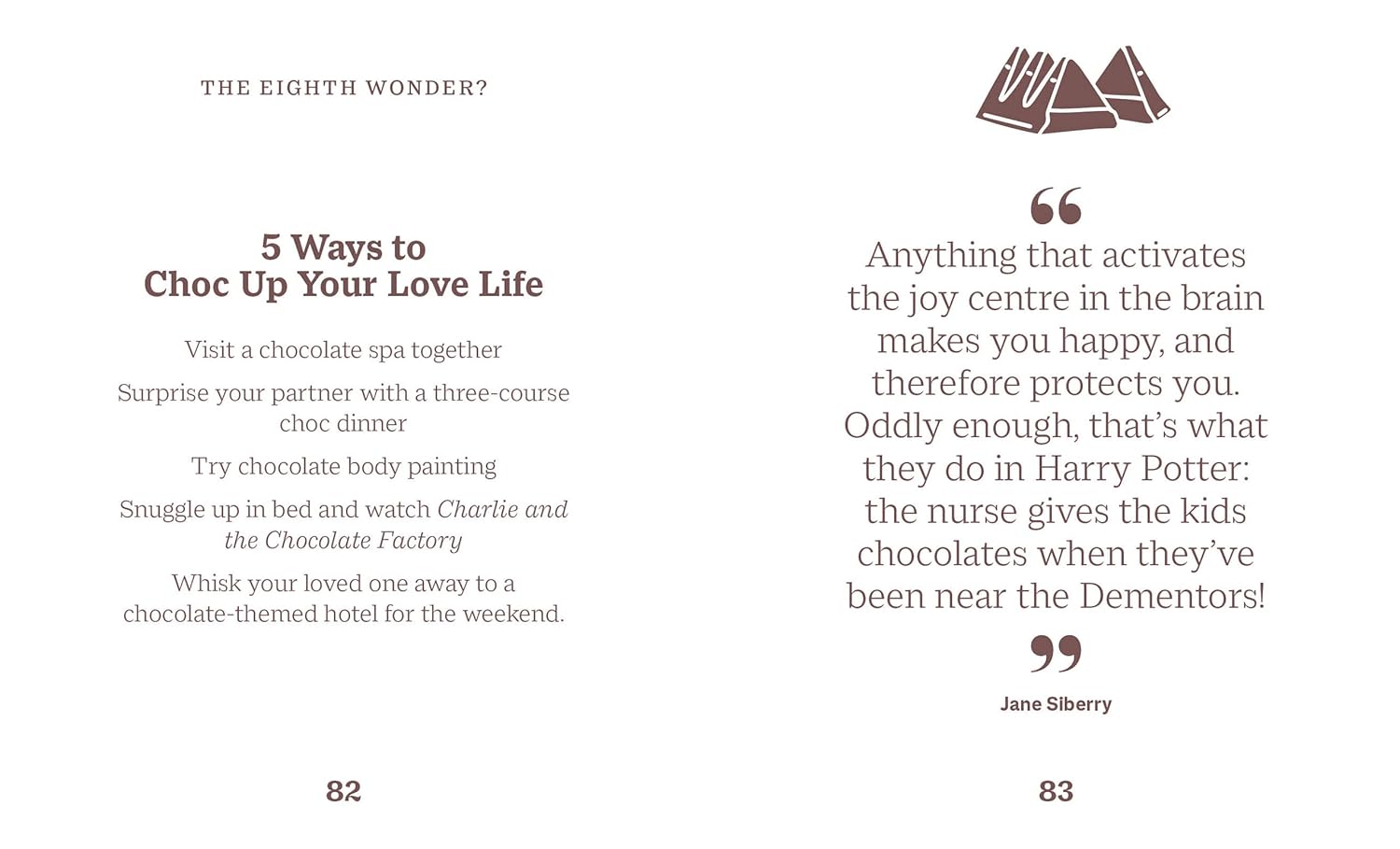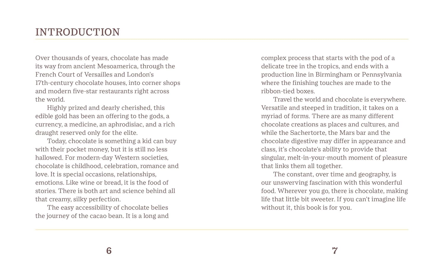 Chỉ cần lướt qua vài trang là bạn sẽ muốn ngay một thanh sô cô la nâu (hay trắng) để tận hưởng thiên đường ngọt ngào trong tay mình! Trích dẫn mẫu: "Tất cả những gì bạn cần là tình yêu. Nhưng thỉnh thoảng một chút sô cô la cũng chẳng hại gì." – Charles M. Schultz Sự thật mẫu: Tên khoa học của cây cho ra sô cô la là theobroma cacao, nghĩa là "thức ăn của các vị thần".