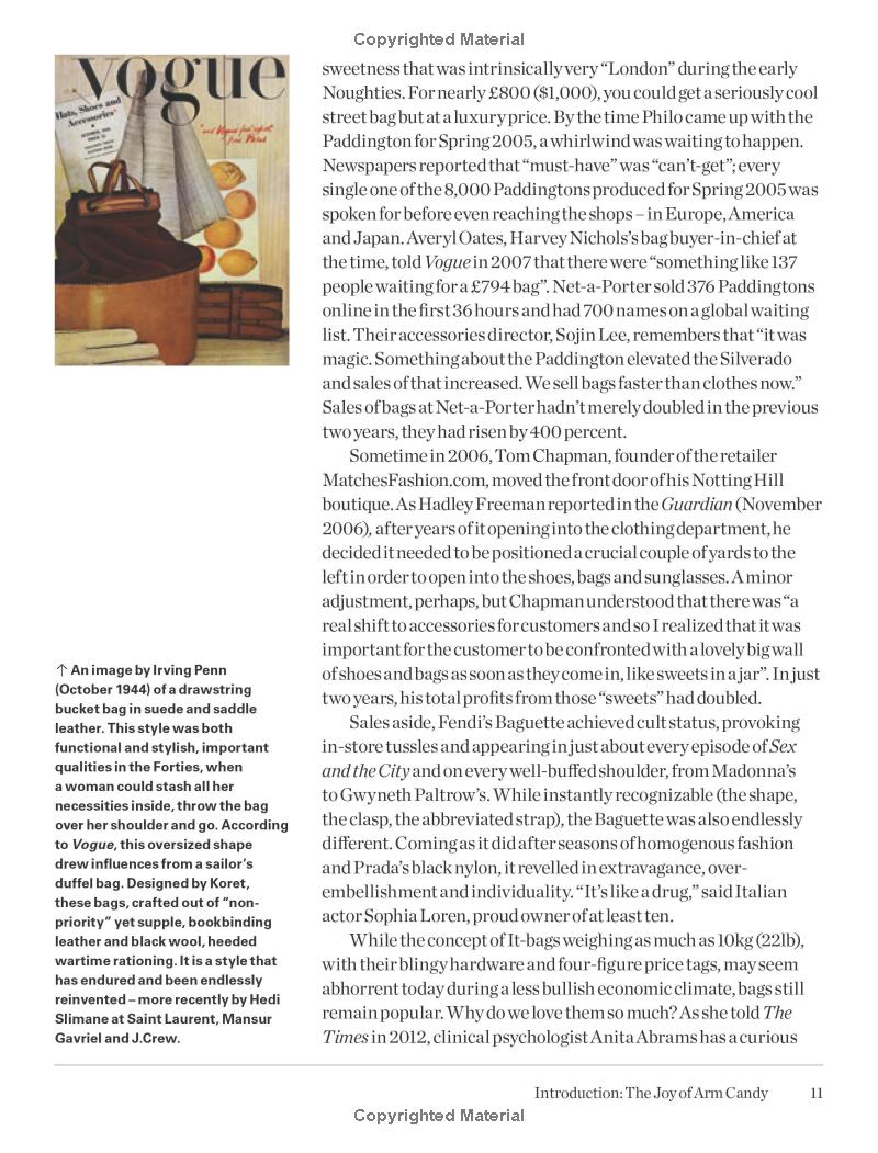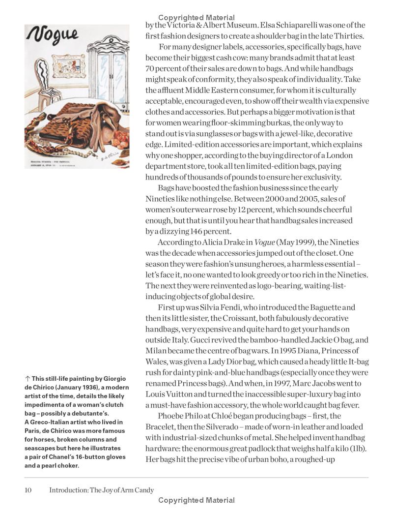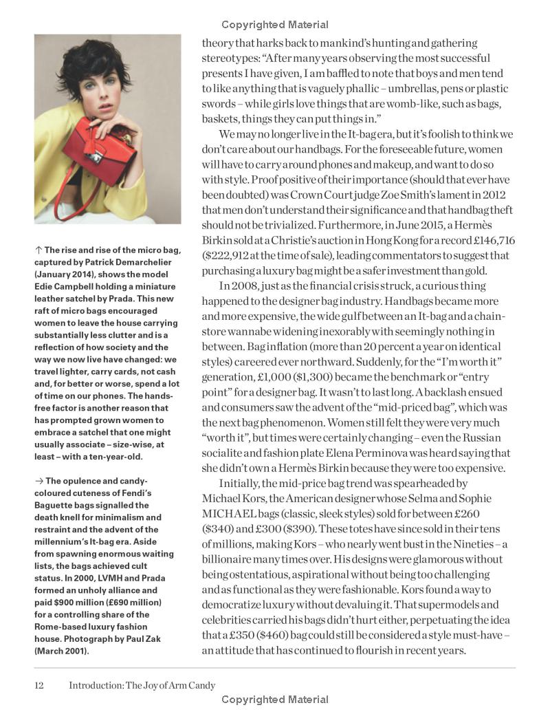 “Bất kỳ người phụ nữ nào cũng có thể mang giày và túi xách – không quan trọng bạn cao bao nhiêu, gầy thế nào, tóc vàng, mắt xanh hay da rám nắng hay không.” – Marc Jacobs Carolyn Asome tiết lộ món phụ kiện thời trang có thể khiến bất kỳ phụ nữ nào cũng cảm thấy tuyệt vời – từ những thiết kế siêu thực đầy màu sắc của Karl Lagerfeld tại Chanel, đến chiếc ba lô nylon mang tính dân chủ của Prada; từ chiếc túi Hermès Birkin đắt giá và giới hạn đến những mẫu cổ điển độc đáo – túi xách là món phụ kiện sáng tạo nhất trong thế giới thời trang. Không có gì ngạc nhiên khi thị trường túi xách hiện nay trị giá hơn 100 tỷ đô la.